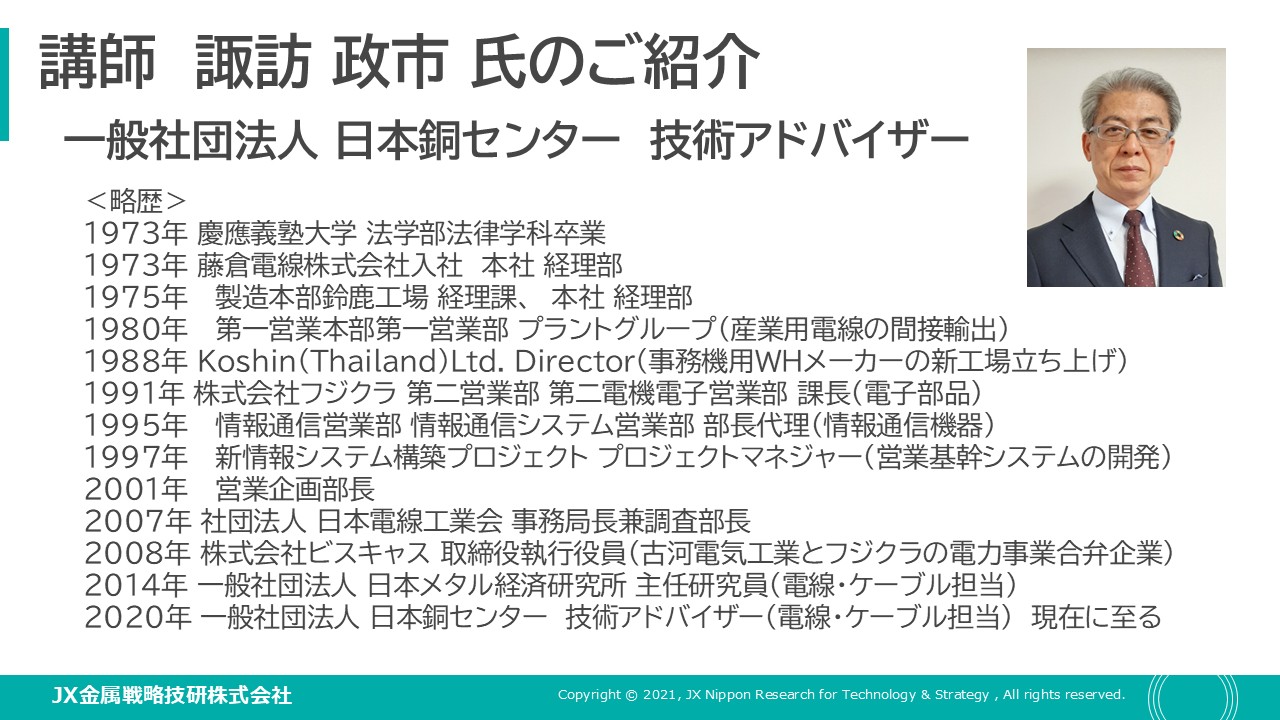 講師は、電線・ケーブル業界の技術開発や用途開発に長年携わる専門家、諏訪政市氏(一般社団法人 日本銅センター 技術アドバイザー)です。